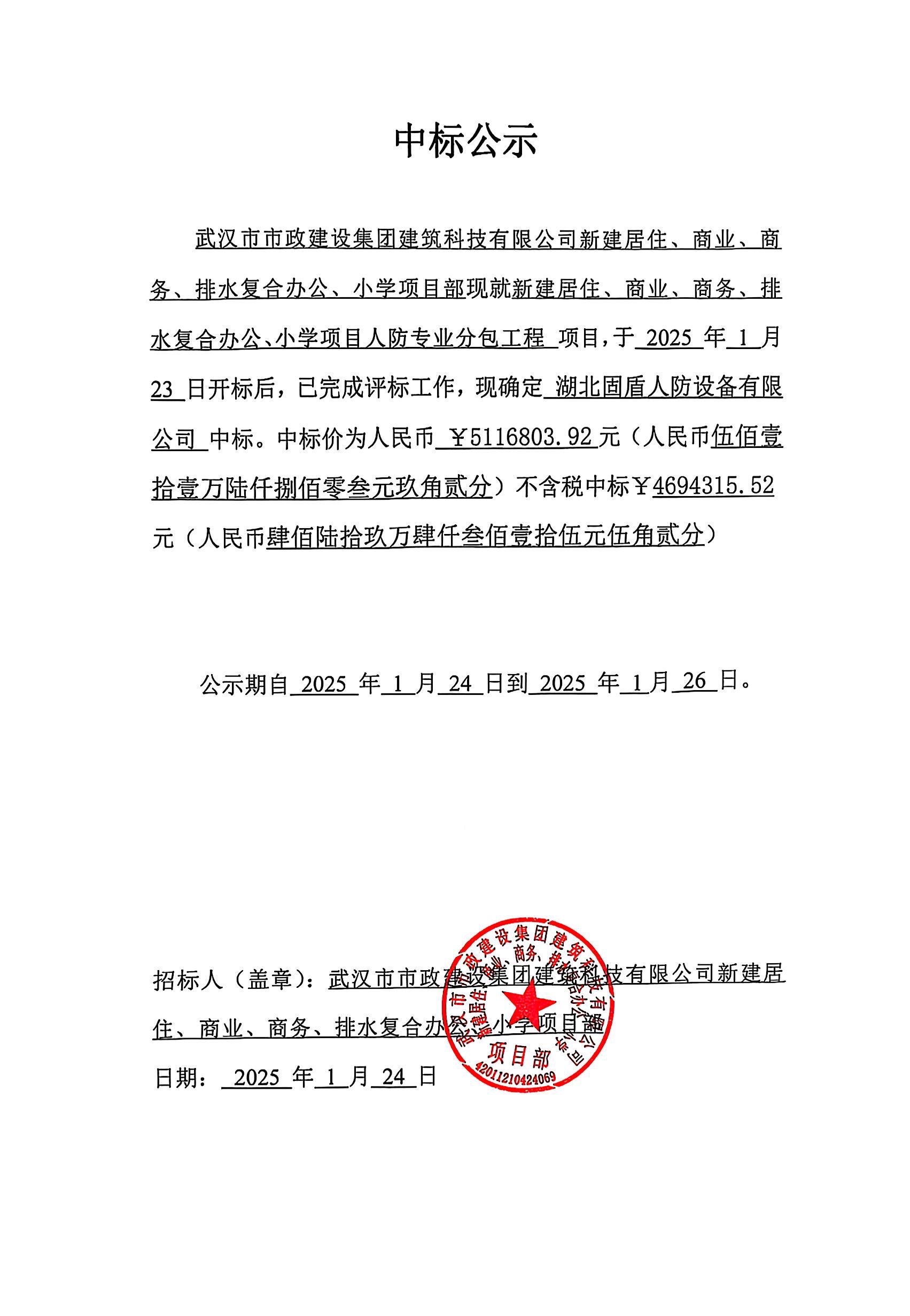 武漢市市政建設(shè)集團(tuán)建筑科技有限公司新建居住、商業(yè)、商務(wù)、排水復(fù)合辦公、小學(xué)項目人防專業(yè)分包工程 中標(biāo)公示