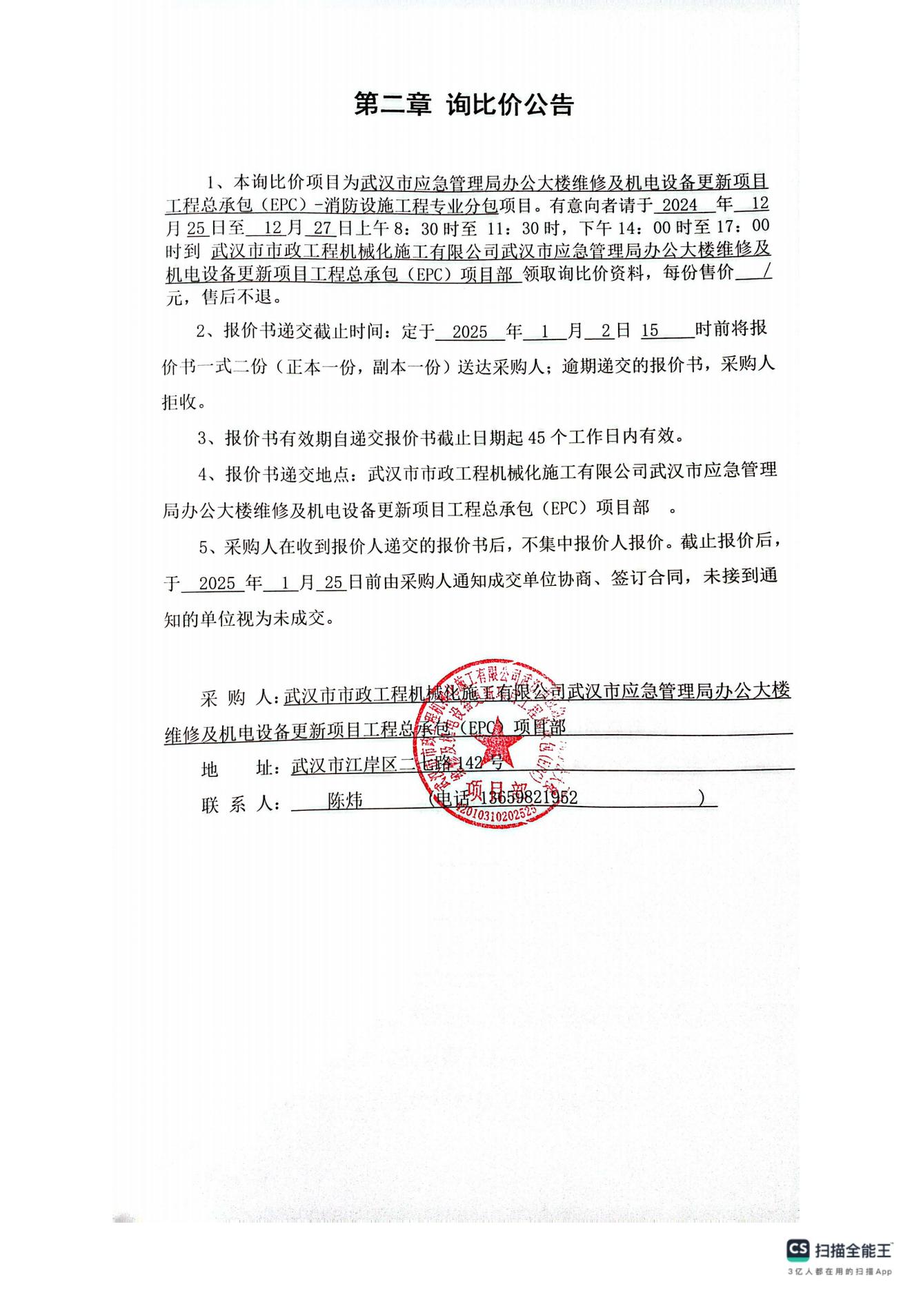 武漢市應(yīng)急管理局辦公大樓維修及機(jī)電設(shè)備更新項目工程總承包(EPC)-消防設(shè)施工程專業(yè)分包詢價公告