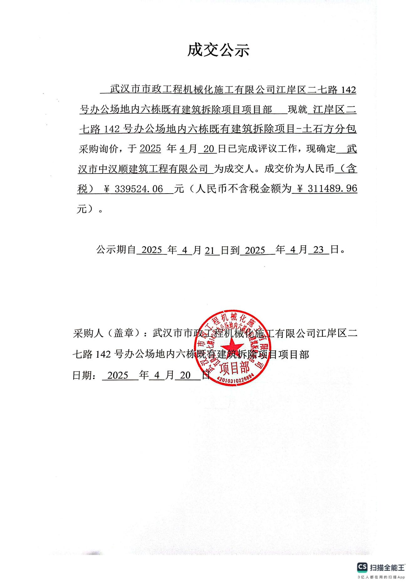 江岸區(qū)二七路142號(hào)辦公場(chǎng)地內(nèi)六棟既有建筑拆除項(xiàng)目-土石方分包成交公告