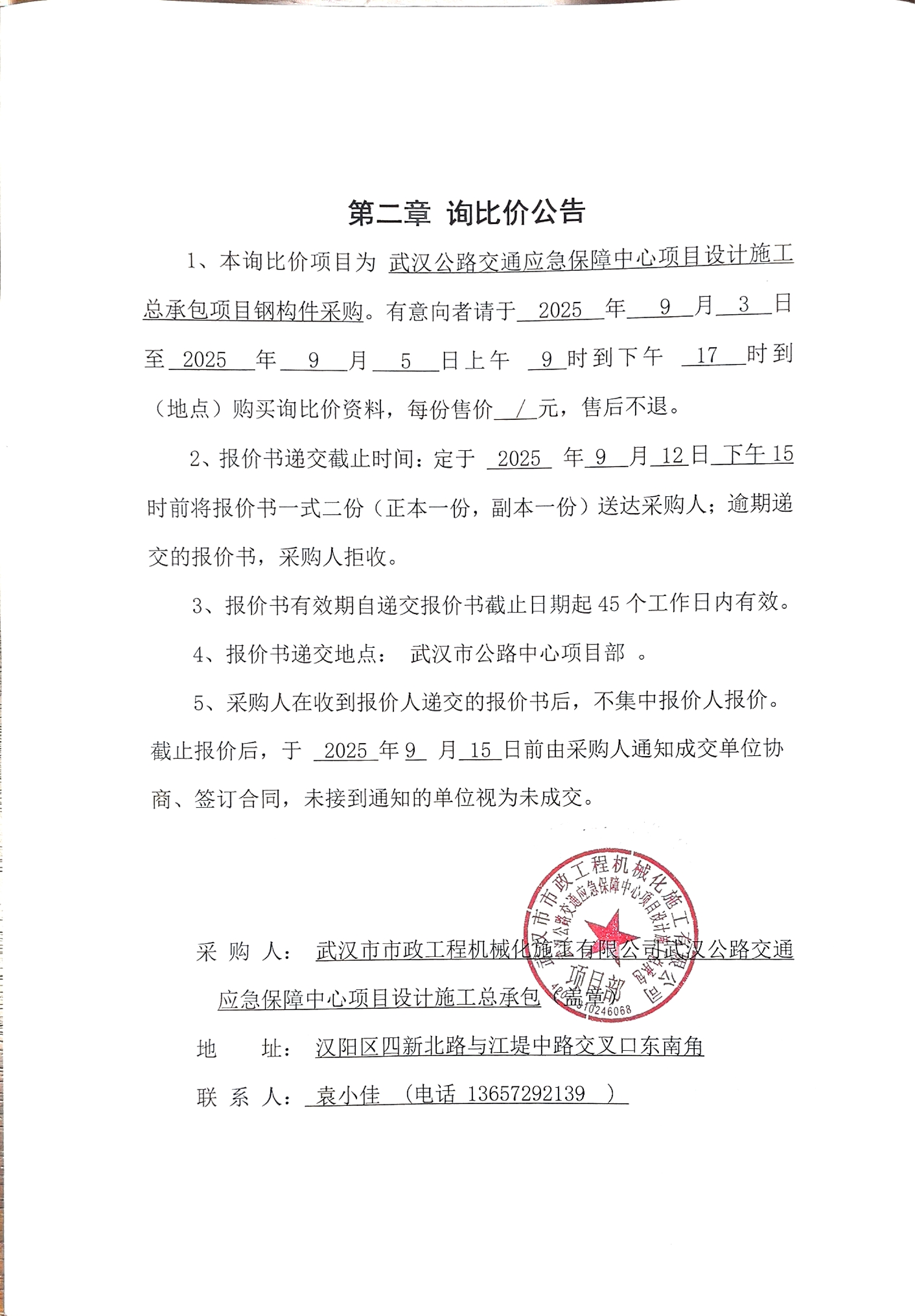 武漢公路交通應(yīng)急保障中心項(xiàng)目設(shè)計(jì)施工總承包項(xiàng)目鋼構(gòu)件采購詢價(jià)公告