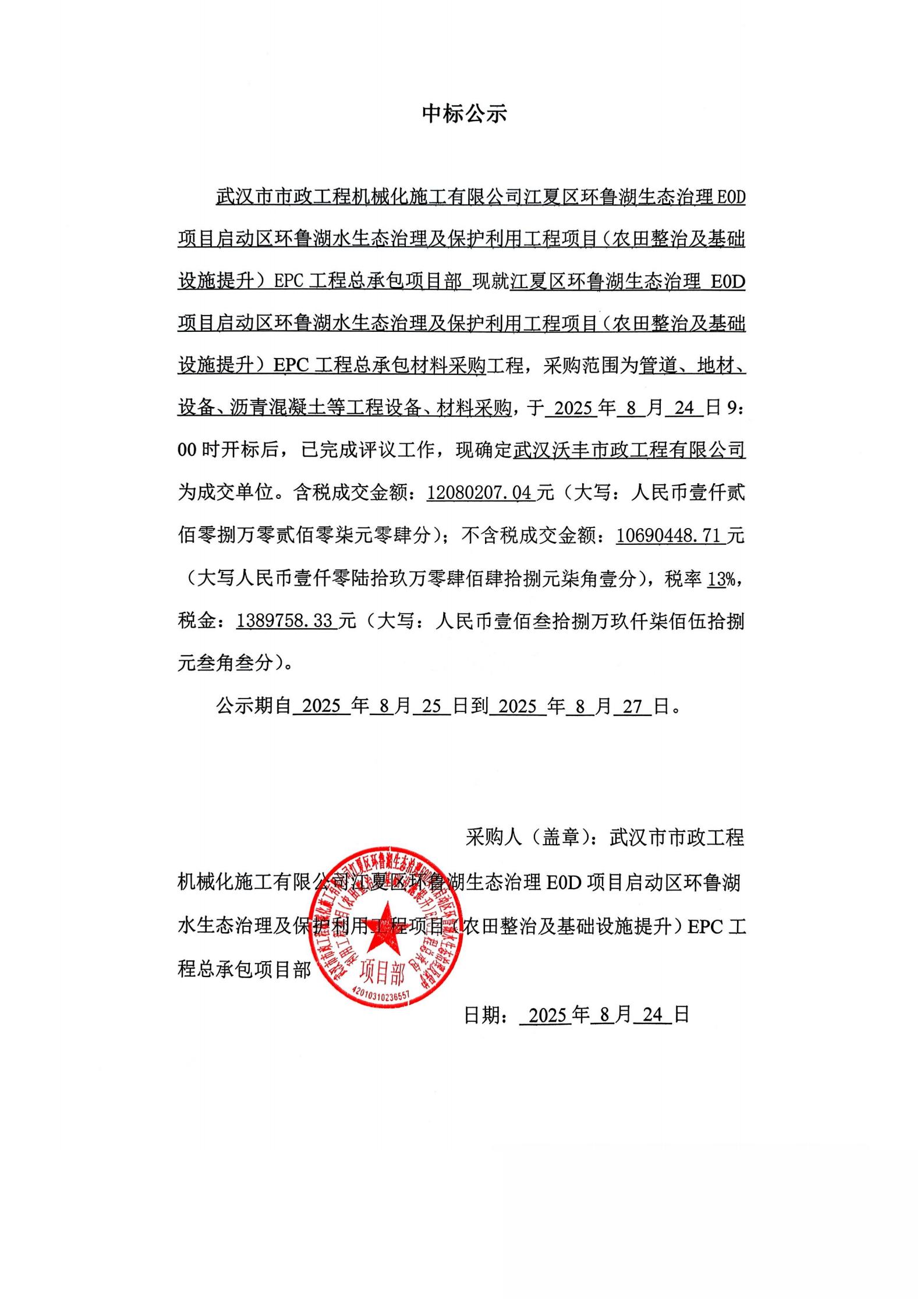 江夏區(qū)環(huán)魯湖生態(tài)治理 E0D 項(xiàng)目啟動區(qū)環(huán)魯湖水生態(tài)治理及保護(hù)利用工程項(xiàng)目(農(nóng)田整治及基礎(chǔ)設(shè)施提升)EPC工程總承包材料采購中標(biāo)公示