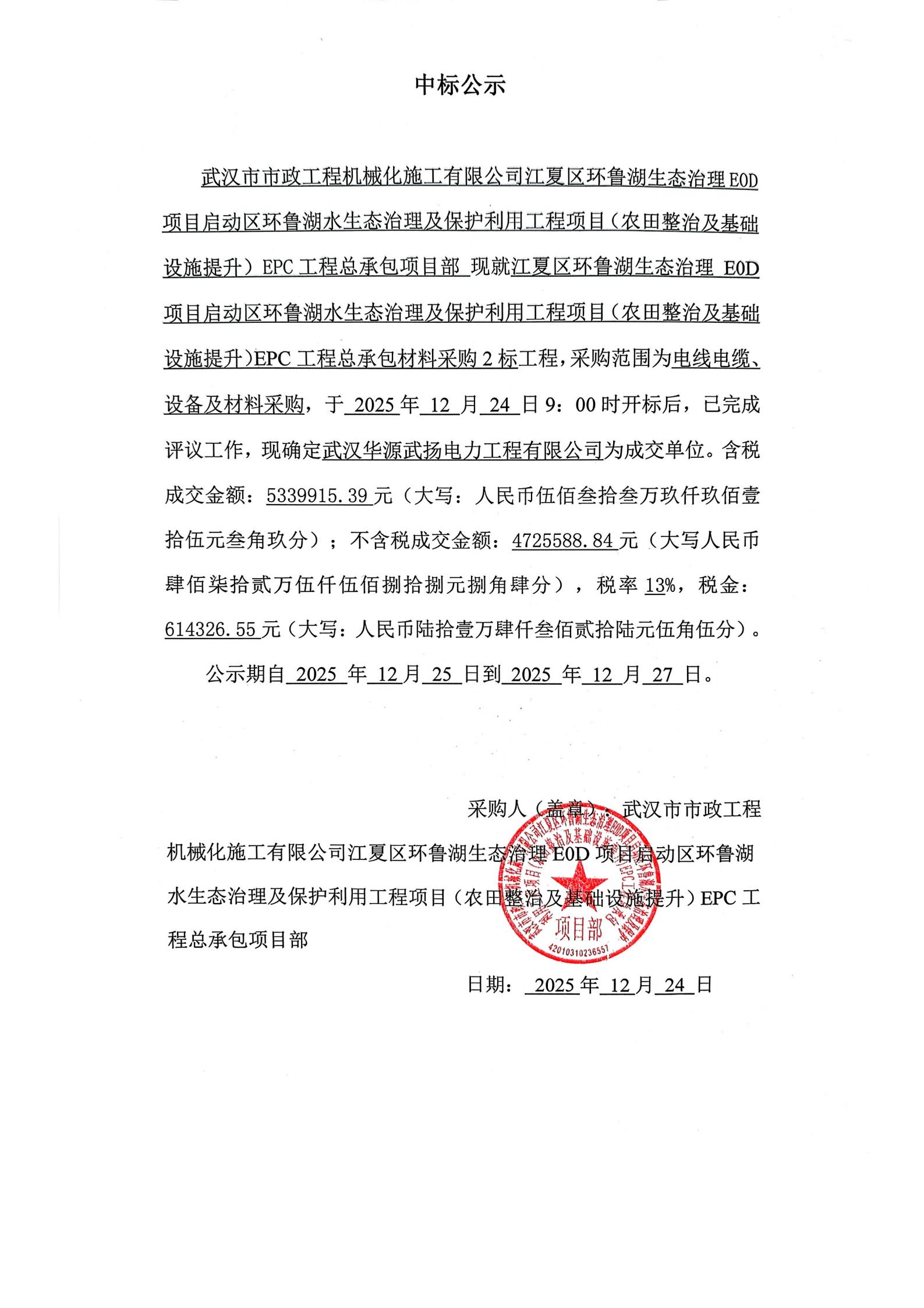 江夏區(qū)環(huán)魯湖生態(tài)治理 E0D 項(xiàng)目啟動(dòng)區(qū)環(huán)魯湖水生態(tài)治理及保護(hù)利用工程項(xiàng)目(農(nóng)田整治及基礎(chǔ)設(shè)施提升)EPC工程總承包材料采購2標(biāo)中標(biāo)公示