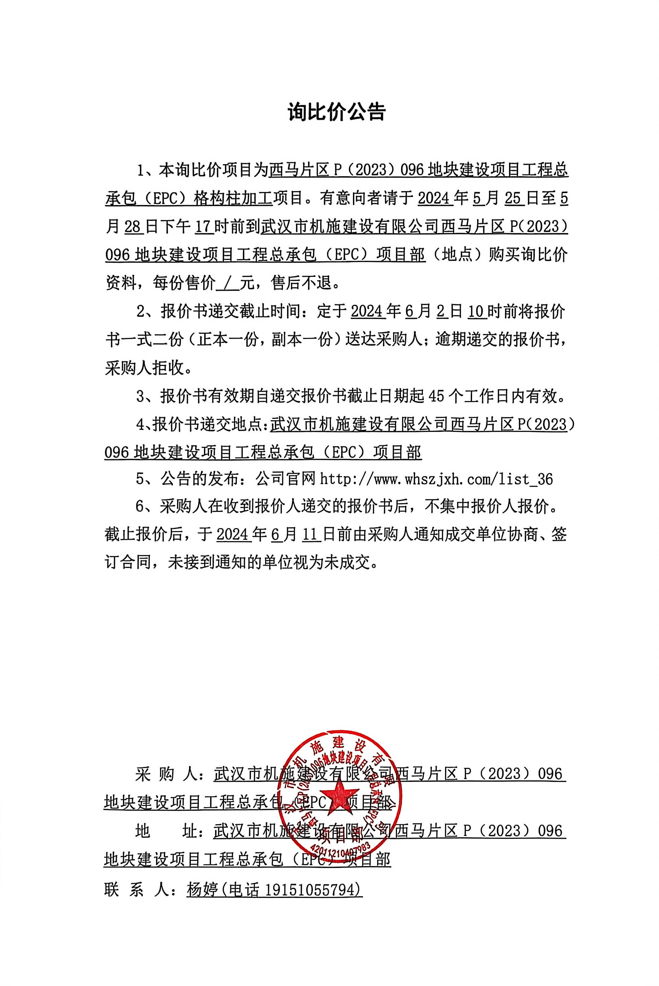 武漢市機(jī)施建設(shè)有限公司稱 西馬片區(qū)P(2023)096 地塊建設(shè)項(xiàng)目工程總承包(EPC)格構(gòu)柱加工詢價(jià)公告