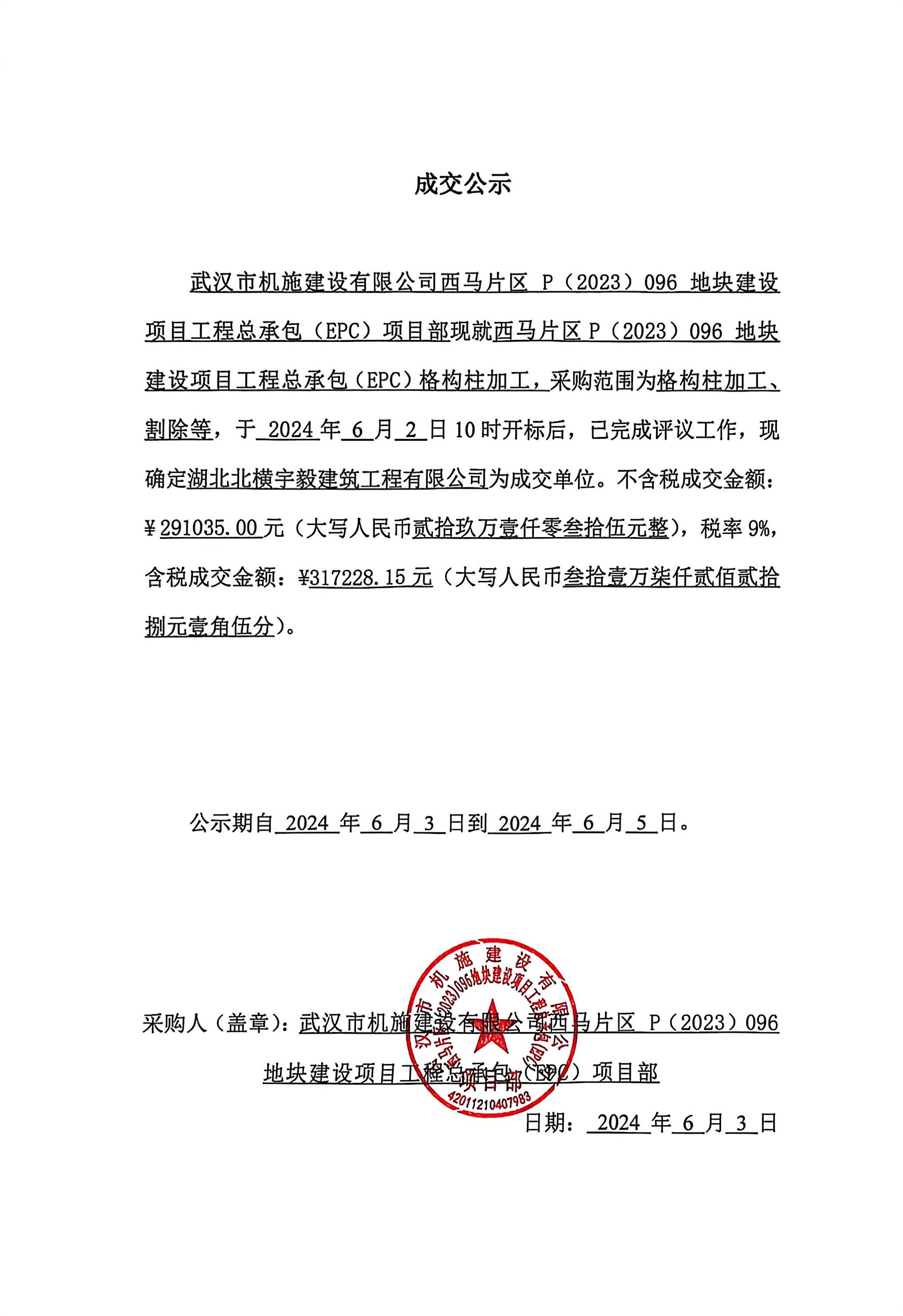 武漢市機施建設(shè)有限公司稱 西馬片區(qū)P(2023)096 地塊建設(shè)項目工程總承包(EPC)格構(gòu)柱加工成交公示