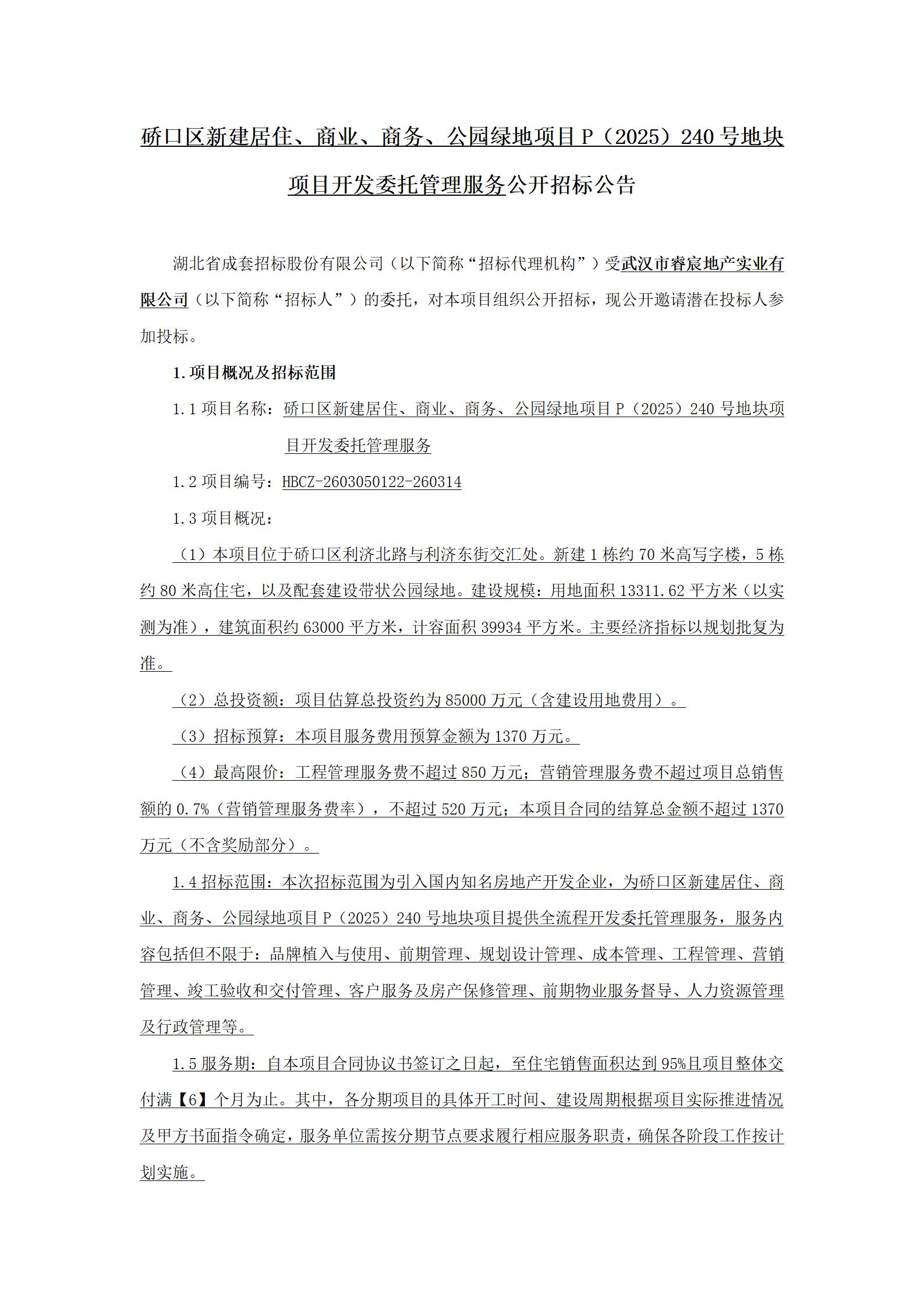 武漢市睿宸地產(chǎn)實(shí)業(yè)有限公司-硚口區(qū)新建居住、商業(yè)、商務(wù)、公園綠地項(xiàng)目P(2025)240號(hào)地塊項(xiàng)目開(kāi)發(fā)委托管理服務(wù)招標(biāo)公告