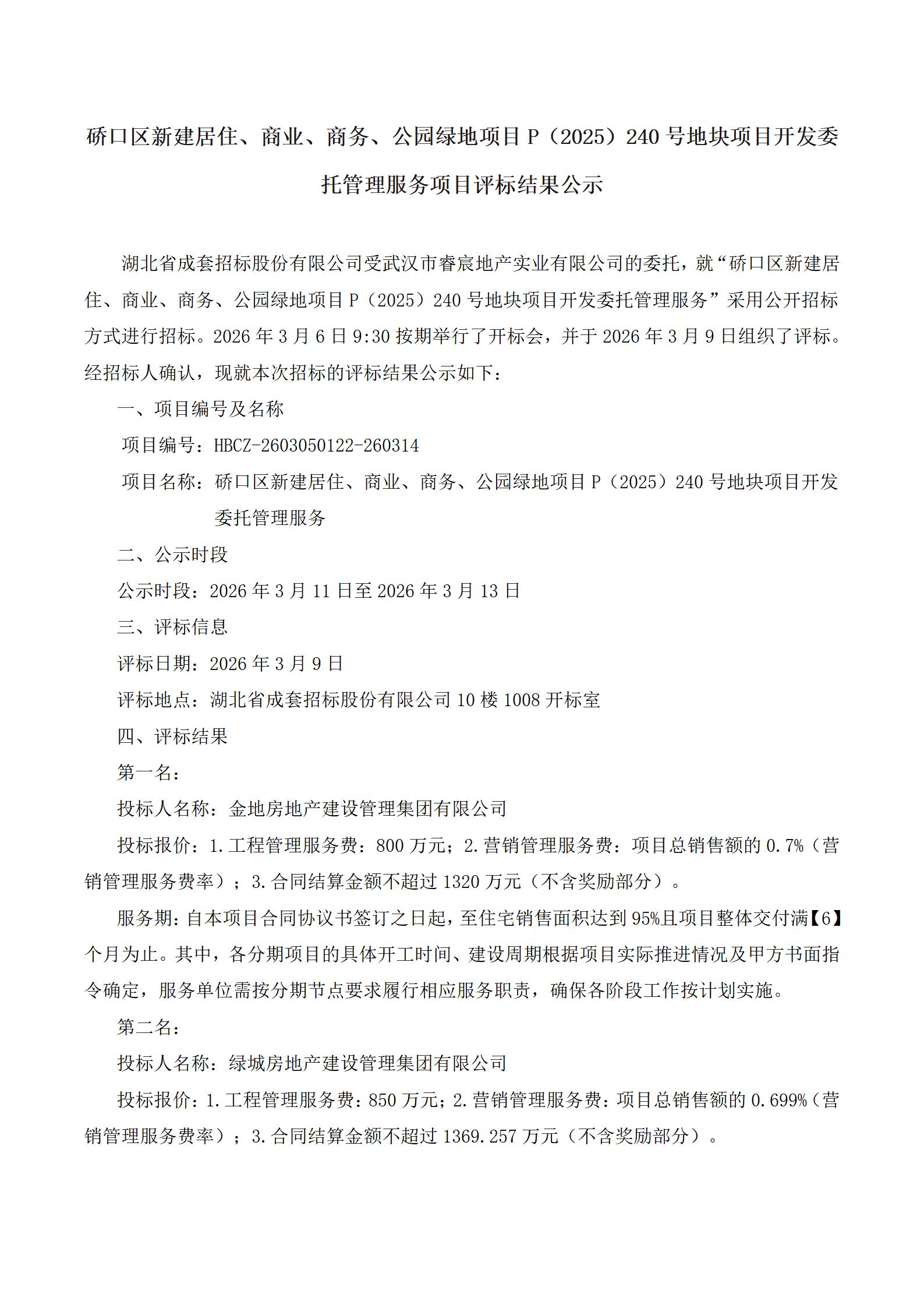 武漢市睿宸地產(chǎn)實(shí)業(yè)有限公司-硚口區(qū)新建居住、商業(yè)、商務(wù)、公園綠地項(xiàng)目P(2025)240號地塊項(xiàng)目開發(fā)委托管理服務(wù)評標(biāo)結(jié)果公示