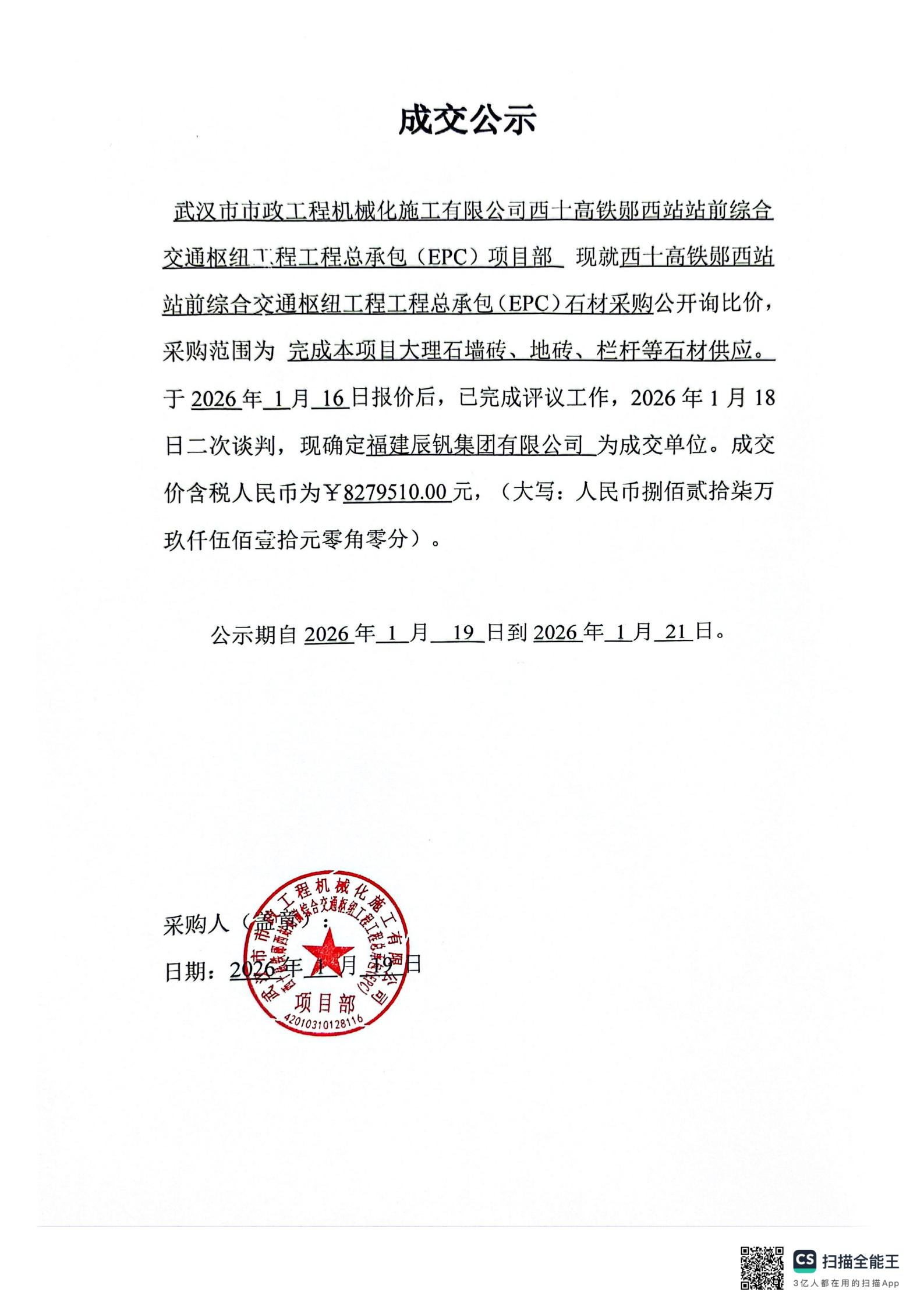 西十高鐵鄖西站站前綜合交通樞紐工程工程總承包(EPC)石材采購(gòu)成交公示