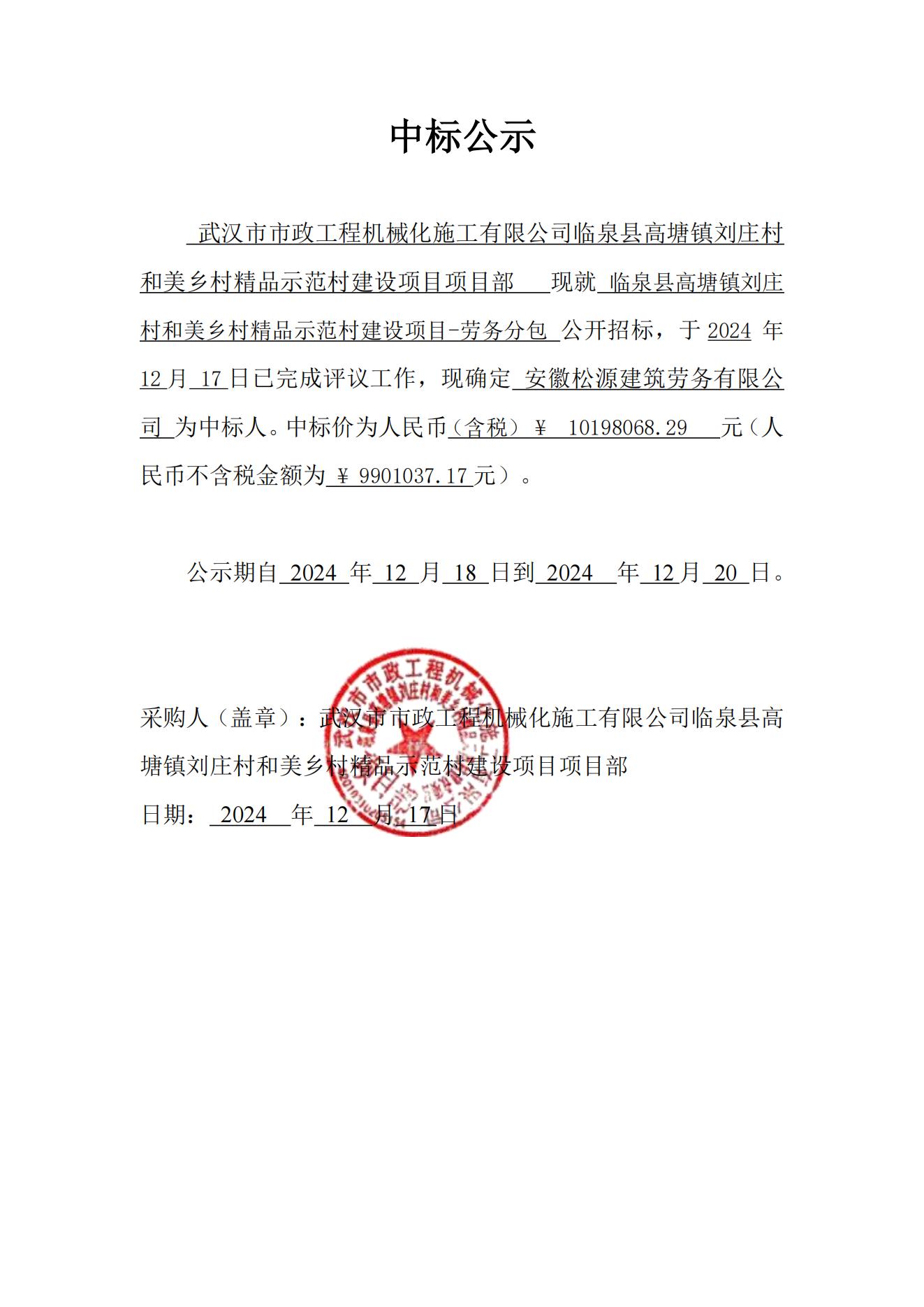 臨泉縣高塘鎮(zhèn)劉莊村和美鄉(xiāng)村精品示范村建設(shè)項(xiàng)目-勞務(wù)分包中標(biāo)公示