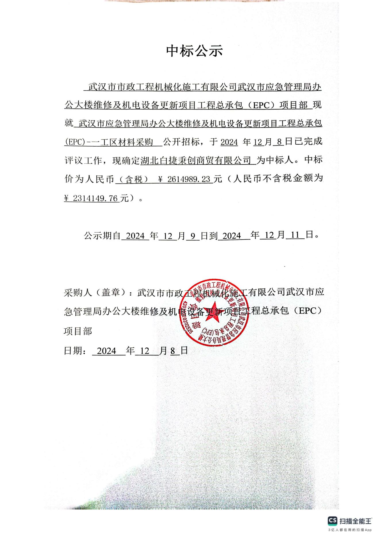 武漢市應(yīng)急管理局辦公大樓維修及機(jī)電設(shè)備更新項(xiàng)目工程總承包(EPC)-一工區(qū)材料采購(gòu)中標(biāo)公示