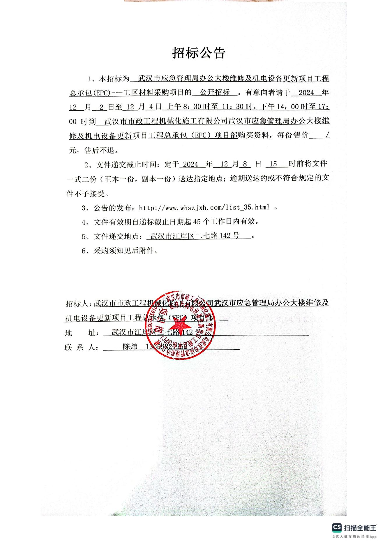 武漢市應(yīng)急管理局辦公大樓維修及機(jī)電設(shè)備更新項(xiàng)目工程總承包(EPC)-一工區(qū)材料采購(gòu)招標(biāo)公告