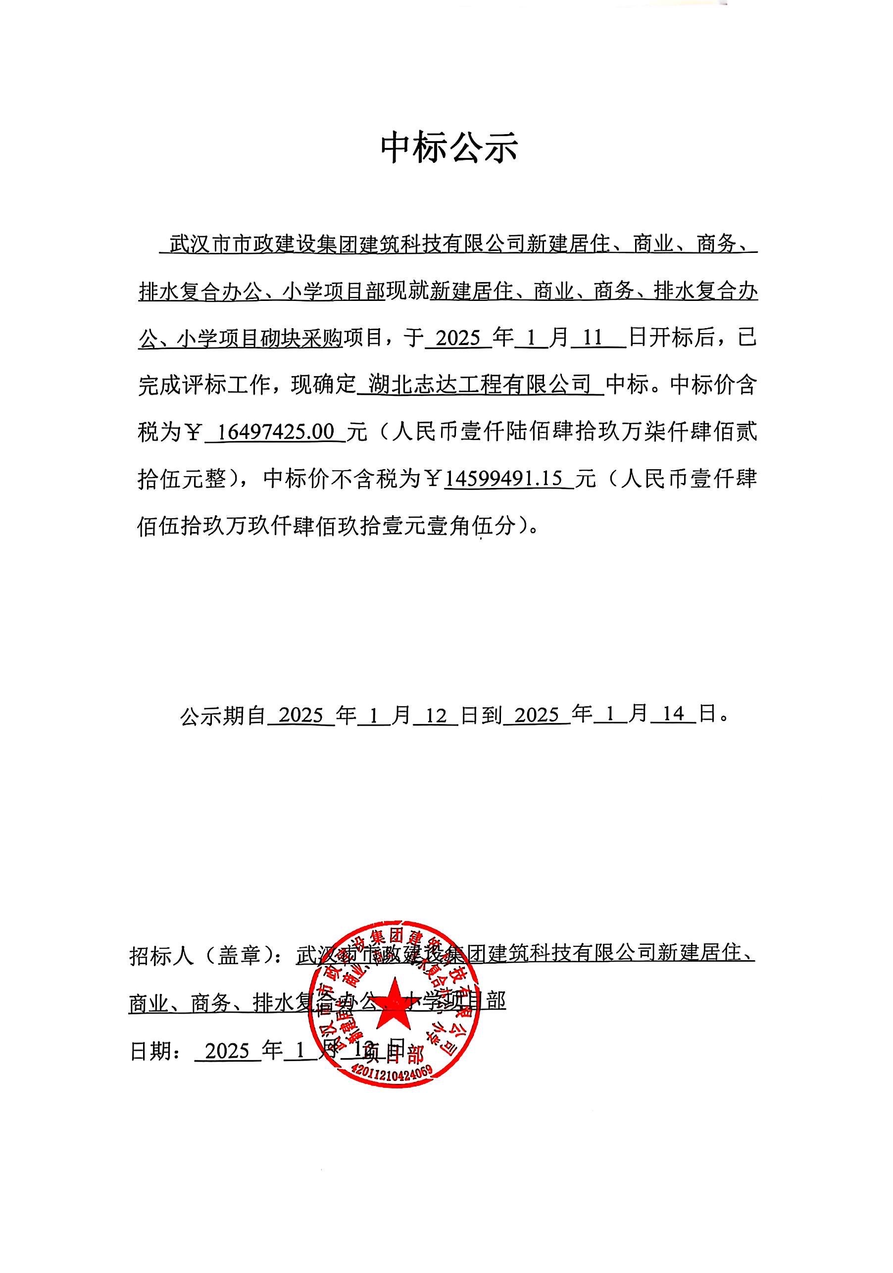 武漢市市政建設(shè)集團(tuán)建筑科技有限公司新建居住、商業(yè)、商務(wù)、排水復(fù)合辦公、小學(xué)項(xiàng)目砌塊采購(gòu)中標(biāo)公示