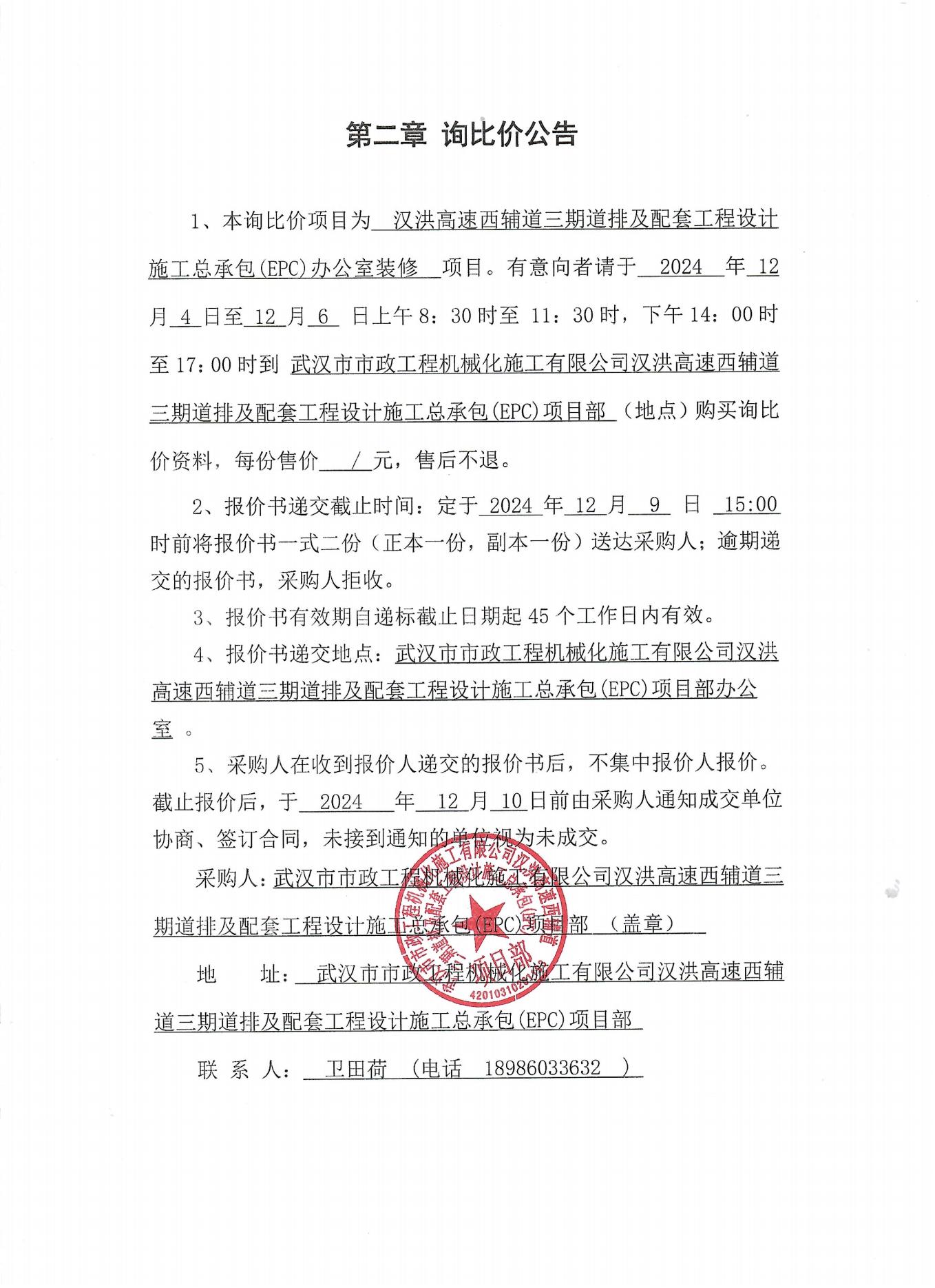 漢洪高速西輔道三期道排及配套工程設(shè)計(jì)施工總承包(EPC)辦公室裝修詢價(jià)公告